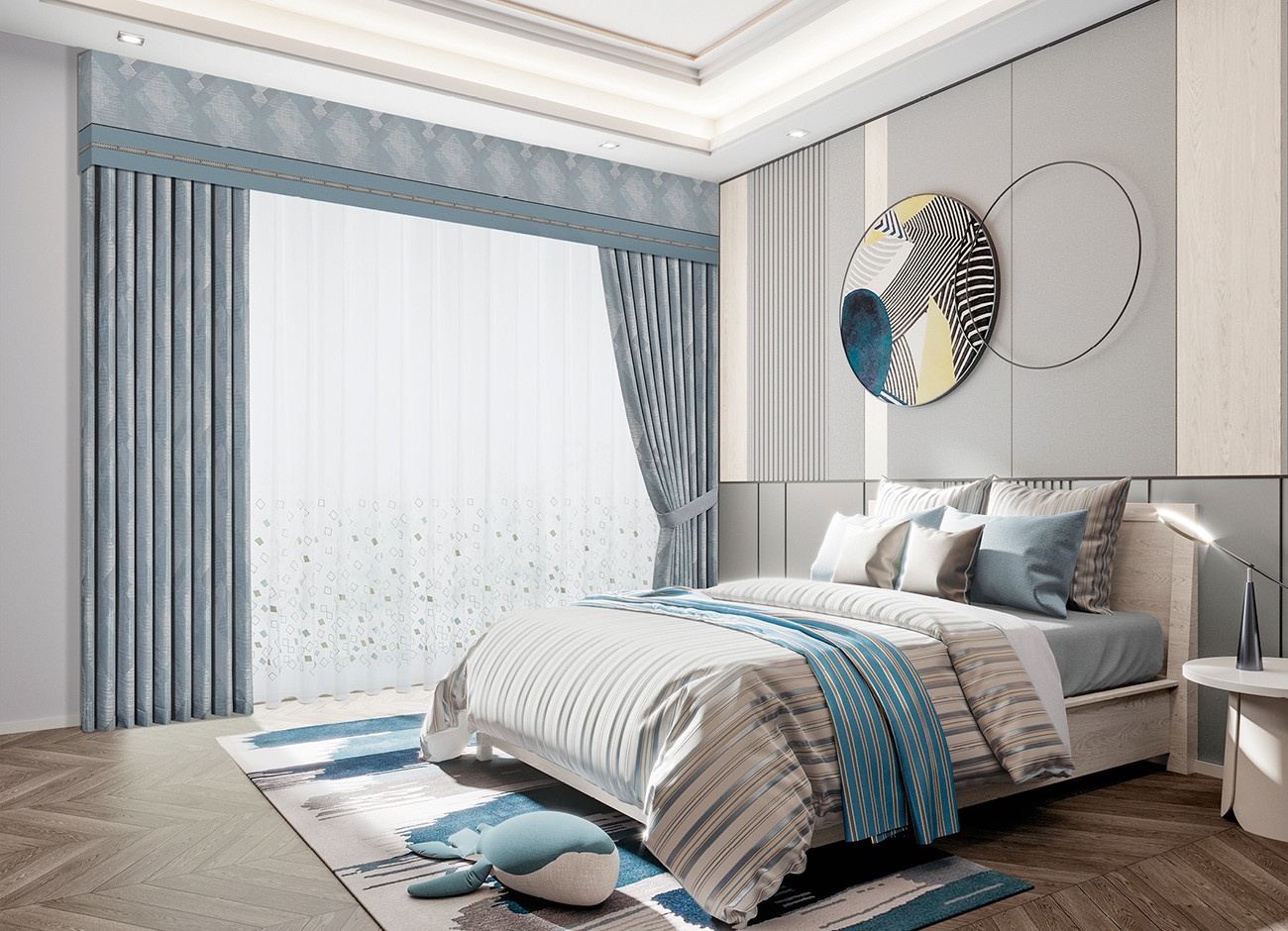 以清雅的藍(lán)調(diào)為基底,菱格圖案交疊,形成萬花筒般的絢爛,演變出至美的繁花之境,空間變得奪目,令人心生向往。