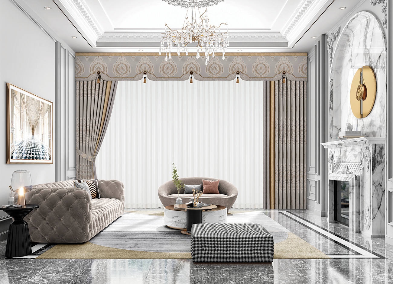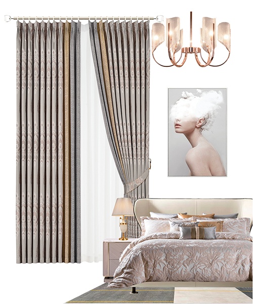 透過香檳色的窗簾,光的影子隱隱團簇在窗邊,空間變得通透起來。簾上的紋樣筆觸細膩,營造層次與新古典格調。
