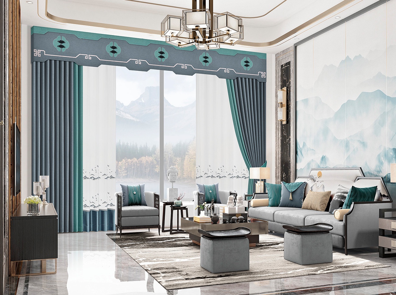 將傳統(tǒng)盤(pán)扣元素和回字紋用于窗簾,錯(cuò)落有致排列,如詩(shī)一般的景致。富有變化的色彩與軟裝陳設(shè),彌漫清新質(zhì)樸的味道,清雅而溫馨的中式腔調(diào)展露無(wú)遺。橫豎分明的空間勾勒,呈現(xiàn)東方簡(jiǎn)雅氣質(zhì),不落塵俗。